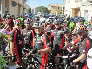 Salida a toda cebolla, buscando huecos de un sitio para otro con mucha suavidad para no chocar con nadie, ni por delante ni por detrás, avanzando por caminos anchos y picando para arriba los primeros cinco kms, complicados por la velocidad, los charcos y los tapones que te hacen perder rueda o no encontrar hueco. Voy asfixiado, llevo ropa demás, la térmica, el windtex, el maillot del equipo, el chubasquero, sin conocimiento ninguno, vamos.
